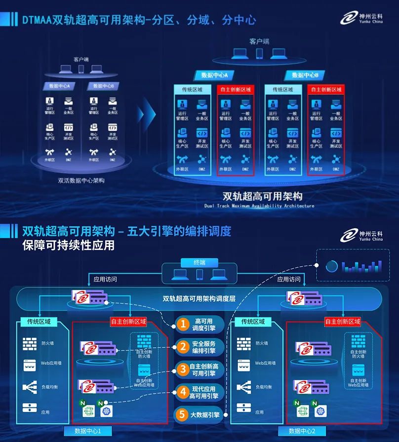 為助力銀行業(yè)務高質(zhì)量發(fā)展,更好地應對數(shù)字經(jīng)濟時代對可持續(xù)性的高要求,實現(xiàn)“信創(chuàng)”與“數(shù)字化”齊頭并進,leyu.樂魚創(chuàng)新性的推出了雙軌超高可用架構(gòu)。該架構(gòu)在雙活數(shù)據(jù)中心的分區(qū)調(diào)度基礎(chǔ)上,增加信創(chuàng)域和非信創(chuàng)域的分域調(diào)度,實行信創(chuàng)域與傳統(tǒng)域應用全量部署,使雙中心運營變?yōu)殡p中心四區(qū)域并行運行,互為多活,將“0到1”的單軌建設(shè)道路變?yōu)榉謪^(qū)分域協(xié)同的多活雙軌超高可用架構(gòu)。幫助客戶在新架構(gòu)下,保障“信創(chuàng)”的同時解決性能瓶頸,提升穩(wěn)定性,保證應用可持續(xù)性,最終實現(xiàn)信創(chuàng)區(qū)域和非信創(chuàng)區(qū)域的平滑過渡,完成國產(chǎn)化替代目標。