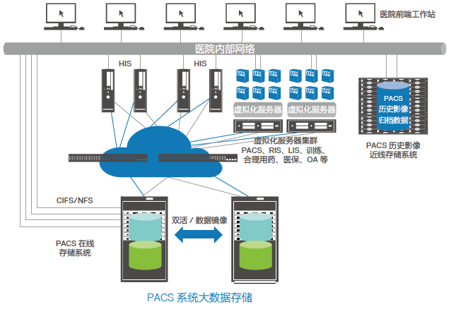 高速調(diào)用影像:采用 SAN+NAS 存儲作為核心存儲,存儲 PACS 系統(tǒng)數(shù)據(jù)庫和在線的 PACS影像文件,提供高速的數(shù)據(jù)訪問能力;